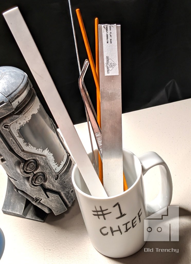 The parts that went into this cosplay photo include: 2 x McFarlane toys, a $2 coffee mug from Savers, a random assortment of long objects and scrap, and 1 sweaty & dishevelled little man.